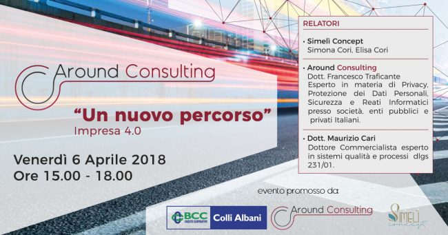 La Simelì Concept Presenta l’Evento “Impresa 4.0 – Un Nuovo Percorso” Saremo relatori nell’evento promosso da Around Consulting insieme a BCC Colli Albani e noi della Simelì Concept. Parleremo di protezione dei dati in vista della nuova normativa che entrerà in vigore dal prossimo 24 Maggio. Per Maggiori informazioni o per prenotare la vostra…